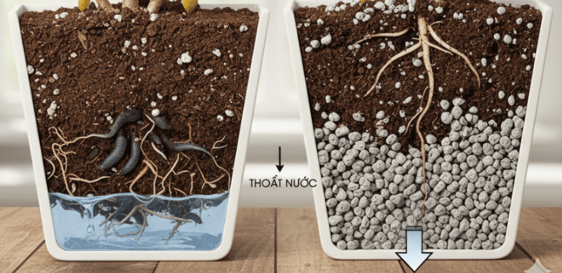 Đây là phương pháp truyền thống nhưng rất hiệu quả. Lót một lớp đá Pumice ở đáy chậu trước khi đổ đất. Nó mang lại hai lợi ích lớn, giúp chống úng rễ: