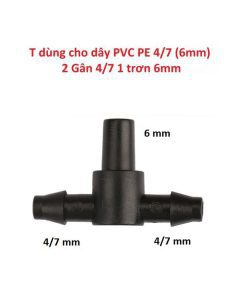 (ống PE Φ4/7) để chia ra nhiều đầu tưới từ dây PE 4/7 ra 1 đâu trơn 6mm sang đầu tưới phun sương, đầu tưới xoay 6mm. Là sản phẩm không thể thiếu, là khớp nối cho hệ thống tưới, sản phẩm có độ đàn hồi cao, bền bỉ với môi trường. Chia 2 cho ống PE Φ3/5 là đầu nối lấy nước từ dây dẫn ống dây dẫn tưới Φ16 và nối vào dây tưới Φ4/7 đầu tưới nhỏ giọt, hoặc que cắm nhỏ giọt.